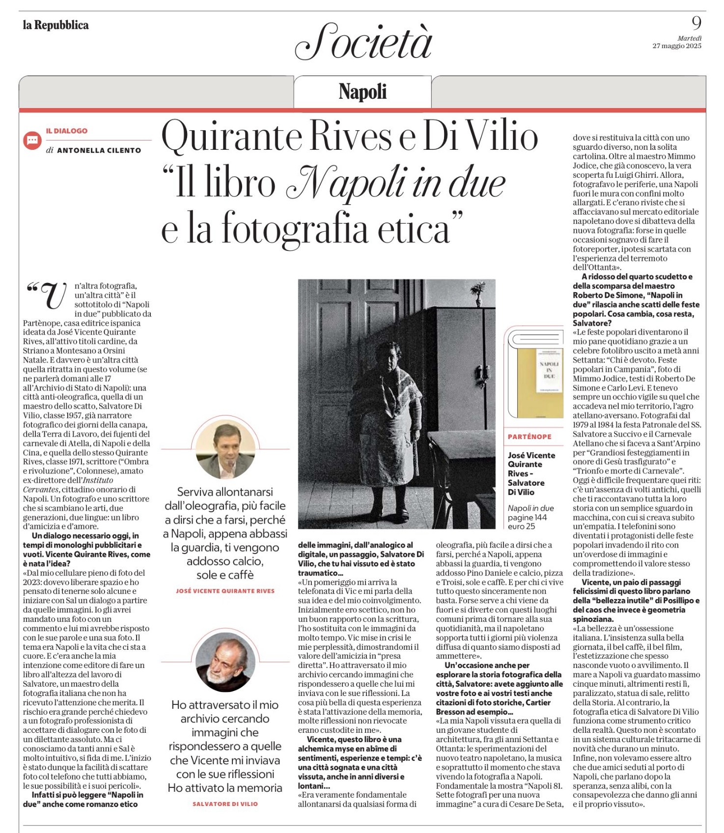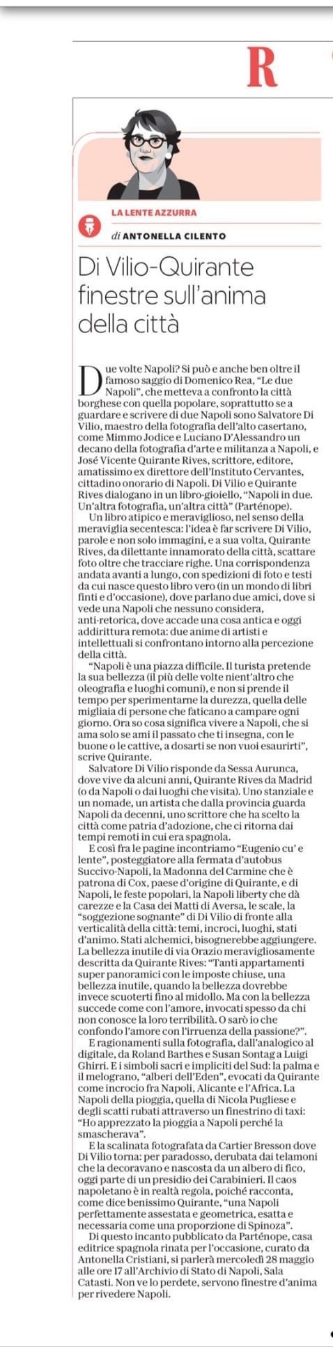 Diálogo firmado por Antonella Cilento en La Repubblica sobre el libro Napoli in due, una reflexión ética y estética en torno a la fotografía y la ciudad de Nápoles a partir del intercambio entre el escritor José Vicente Quirante Rives y el fotógrafo Salvatore Di Vilio.